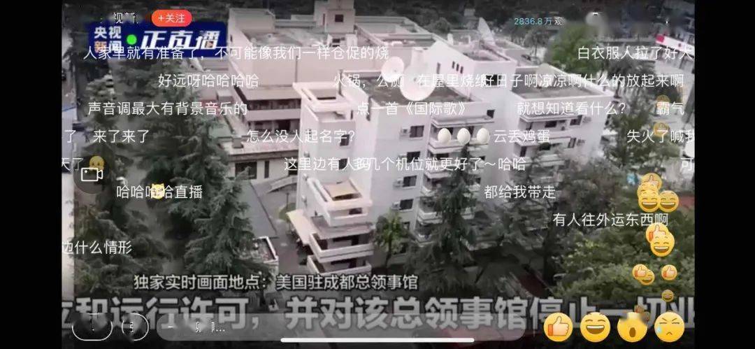 在中方宣布反制举措后,央视开始了美驻成都领馆的实时直播。截至7月24日17时,已有2800万人在线观看。网友留言中,“人不犯我我不犯人,人若犯我我必犯人”被多次提到。