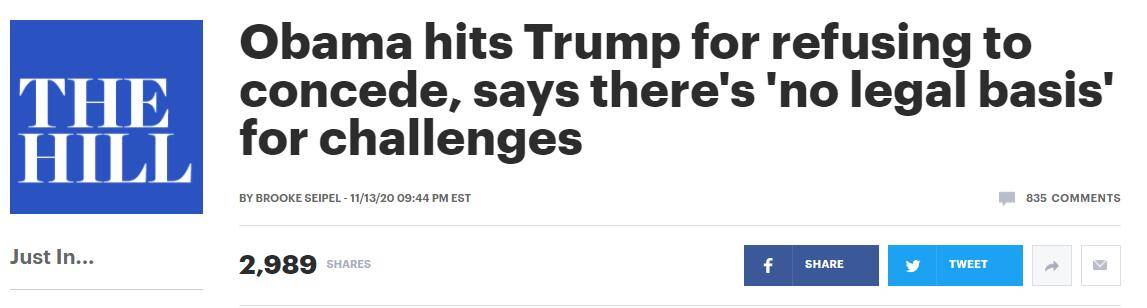 (《国会山报》:奥巴马抨击特朗普拒绝承认败选,称其发起的挑战没有法律依据)