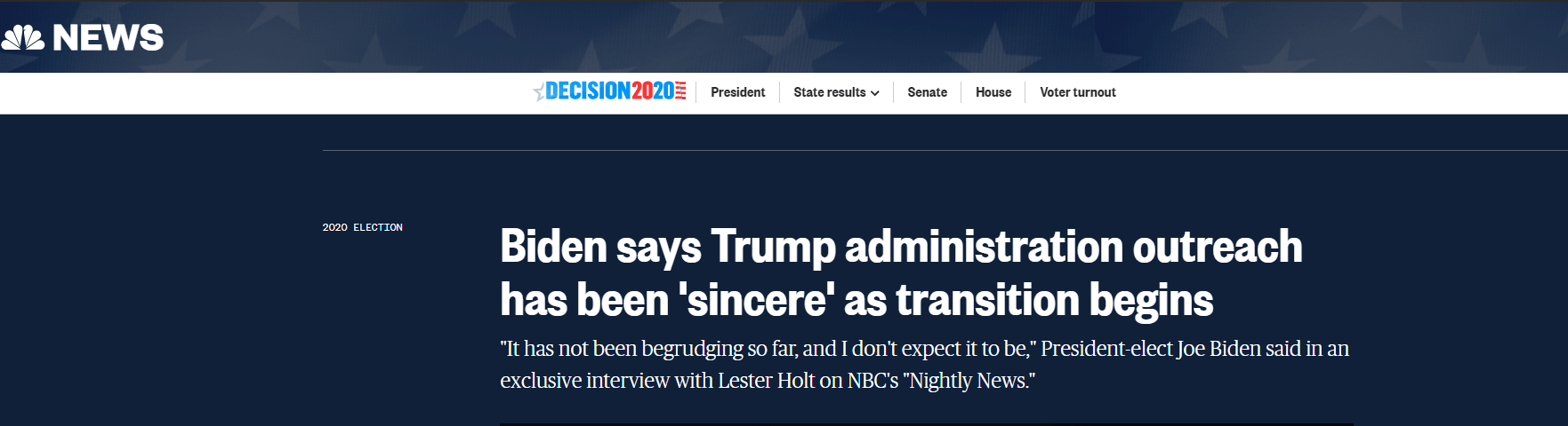 【环球网报道 见习记者 边子豪】据美国全国广播公司(NBC)消息,拜登在接受该媒体专访中表示,特朗普政府已经开始为其(政权)交接团队的工作提供帮助,并且特朗普政府在此过程中态度“真诚”。
