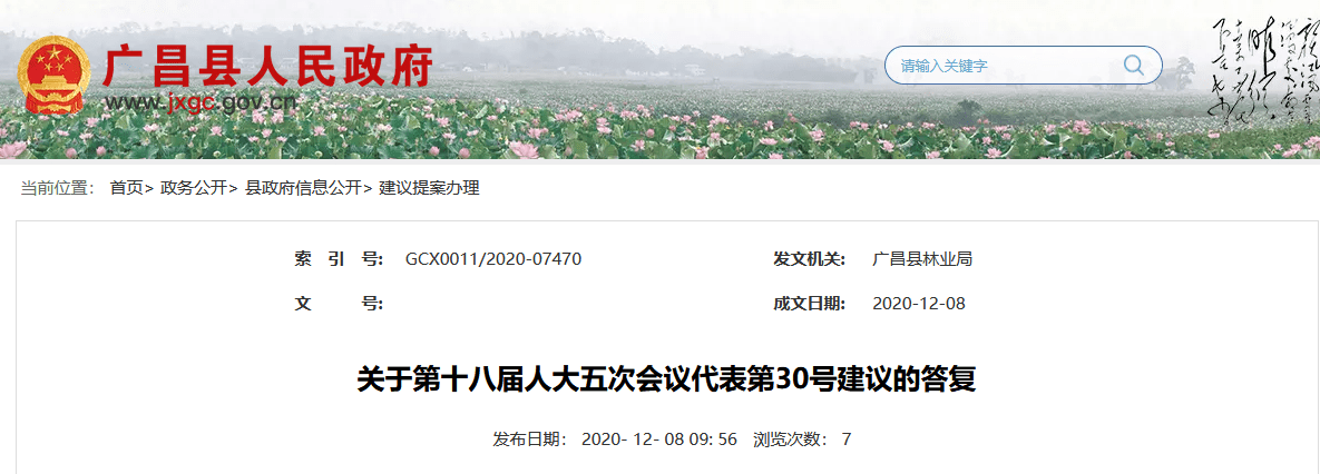 12月8日,广昌县林业局通过广昌县人民政府官网公布了《关于第十八届人大五次会议代表第30号建议的答复》。