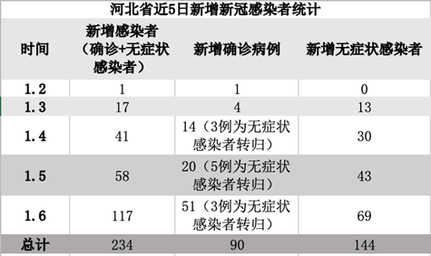 此前,1月2日,河北省石家庄市新增一例本土新冠确诊病例,此后,河北新增本土确诊病例及无症状感染者迅速攀升。截至1月6日,5日来,河北此轮疫情共报告新冠确诊病例90例,无症状感染者114例。