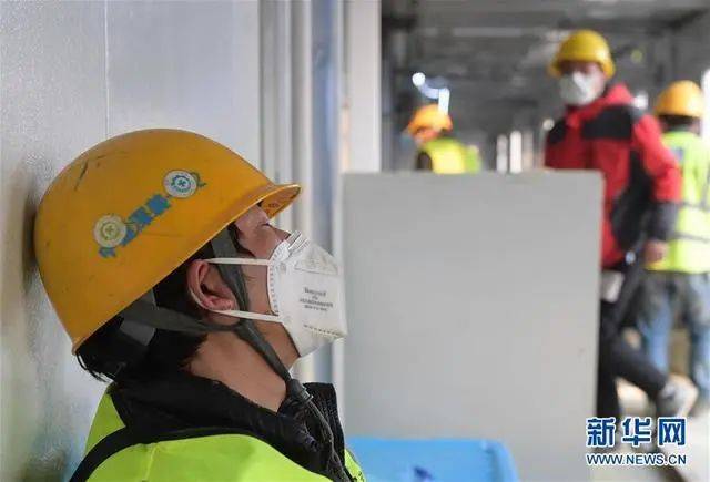 2月3日,一名疲惫的工人在武汉火神山医院工地一处正在施工的病房外小憩。新华社记者 李贺 摄