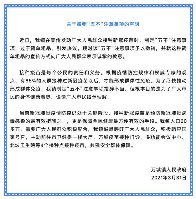 据微信公号万宁发布厅消息,海南万宁万城镇人民政府31日发布声明,在宣传发动广大人民群众接种新冠疫苗时,制定“五不”注意事项,过于简单粗暴,引发热议。 现对该“五不”注意事项予以撤销,并就这种简单粗暴的宣传方式向广大人民群众表示诚挚的歉意。