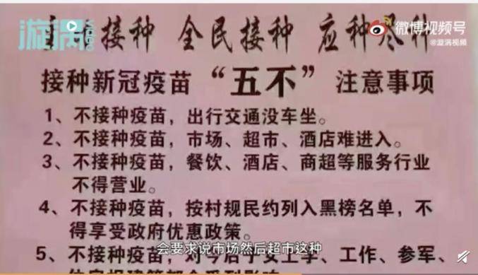 一张网传通知中写道:不接种疫苗,将面临出行交通没车坐,按村规民约列入黑榜名单,不得享受政府优惠政策等情况, 对今后子女上学、工作、参军、住房报建等都会受到影响。