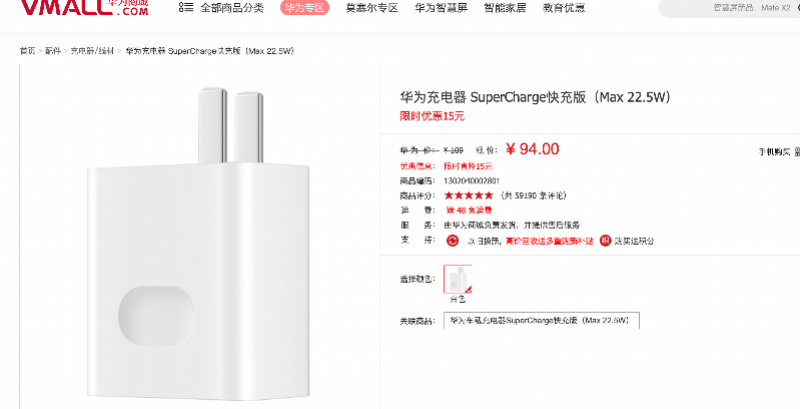 而南都记者在华为官网获悉,目前上述机型在官网的包装和售后描述仍然为“官方标配”,包含华为SuperCharge充电器和USB Type-C 数据线。按照官网售价,华为SuperCharge充电器单个价格为94元(原价109元),而USB Type-C 数据线价格则为20元以上。南都记者注意到,目前华为的多个相关配件处于“暂时缺货状态”。