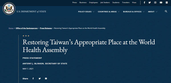 当地时间5月7日,美国国务卿安东尼·布林肯在一份声明中指出,美国呼吁世界卫生组织负责人允许台湾以观察员身份参加即将举行的第74届世界卫生大会(World Health Assembly,WHA)。第74届世界卫生大会将于5月24日至6月1日举行。