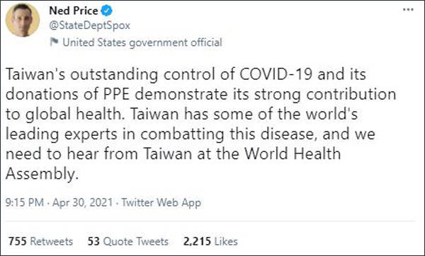 美国国务院发言人内德·普赖斯(Ned Price)4月30日也在推特上表示:“台湾对新冠肺炎的出色控制及其捐赠的个人防护装备,显示出它对全球卫生的巨大贡献。台湾拥有世界上对抗这种疾病的一些顶尖专家,我们需要在世界卫生大会上听到台湾的意见。”