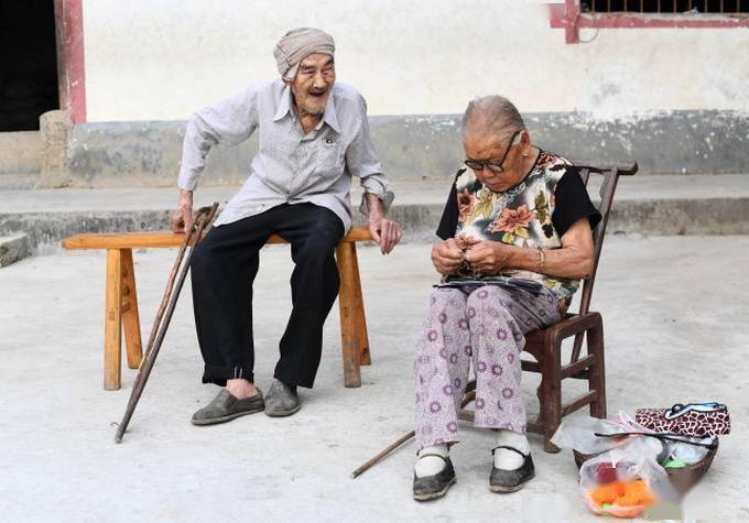 时年100岁的向永山(左)和101岁的吴喜安(右)。他们居住在重庆奉节县冯坪乡皂角村,携手81年来,两个人相濡以沫,没有分开过一天。 新华社记者 王全超 2017年8月23日摄