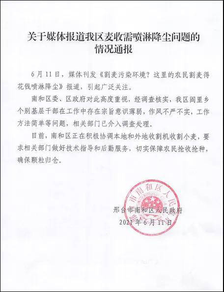 原标题:麦收需要喷淋降尘?邢台市南和区回应:个别干部作风不严不实