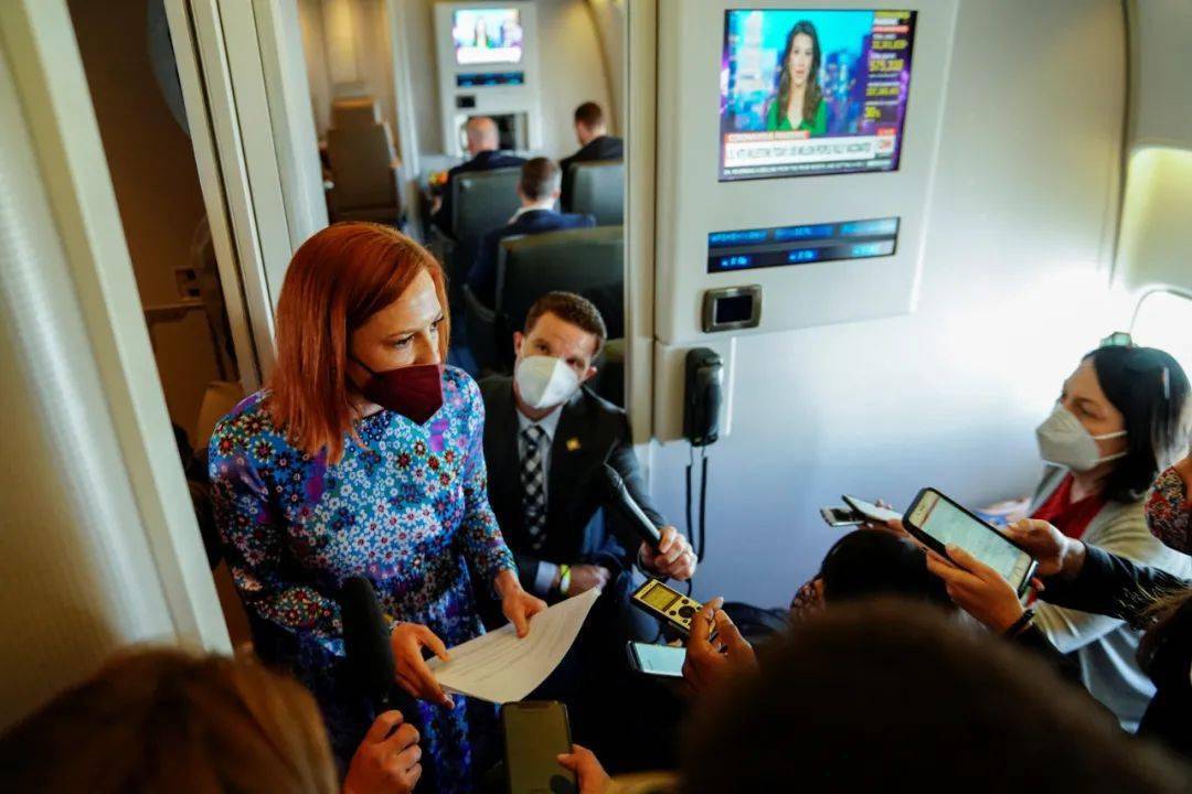 当地时间2021年4月30日,前往美国费城的“空军一号”上,白宫新闻秘书普萨基接受媒体采访。据悉,白宫新闻秘书普萨基当天在一份简短声明中说,由于印度新冠感染病例数极高并存在多种变异新冠病毒传播,根据美国疾病控制和预防中心建议,美国政府将对印度实行旅行限制措施。/IC photo