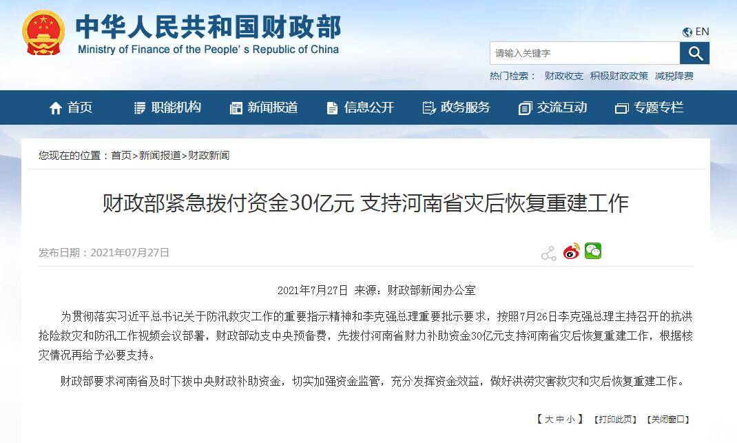 中新网7月27日电 据财政部网站消息,为贯彻落实习近平总书记关于防汛救灾工作的重要指示精神和李克强总理重要批示要求,按照7月26日李克强总理主持召开的抗洪抢险救灾和防汛工作视频会议部署,财政部动支中央预备费,先拨付河南省财力补助资金30亿元支持河南省灾后恢复重建工作,根据核灾情况再给予必要支持。