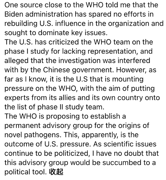 “美国批评世卫组织第一阶段新冠溯源研究小组缺乏代表性,并声称其受到中国政府的干预。但据我所知,给世卫组织施加越来越大压力的正是美国,它的目的是将其盟友和本国的专家列入第二阶段研究小组名单。”