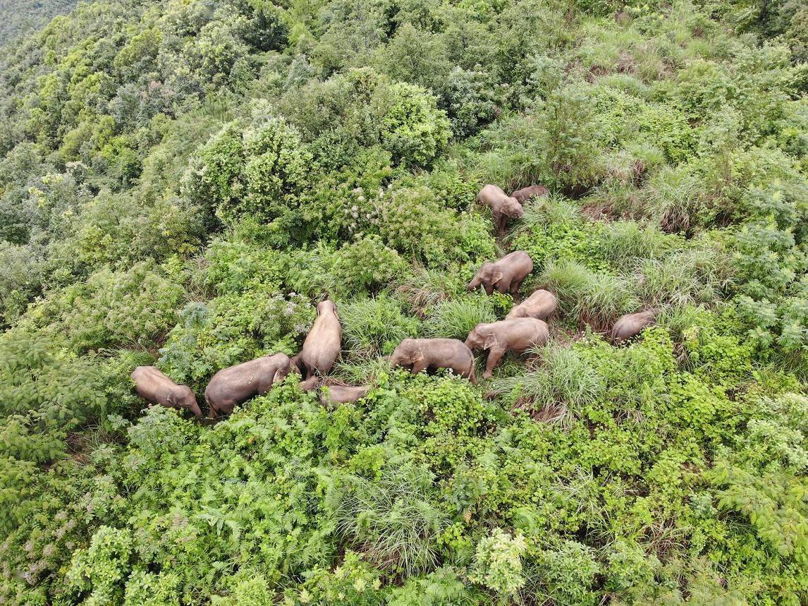 过去数月,队员们见证着这些大家伙吃吃逛逛。杨翔宇说,来到普洱的这些天,“短鼻家族”好像肚子又大了些,身体又胖了点儿。“家族里有一只小象,之前还没有人高,头发还很浓密,总是在母象怀抱里簇拥着行走。现在它长大了,有时单独跑出去,吃点东西,玩耍一下,再回到队伍里。”