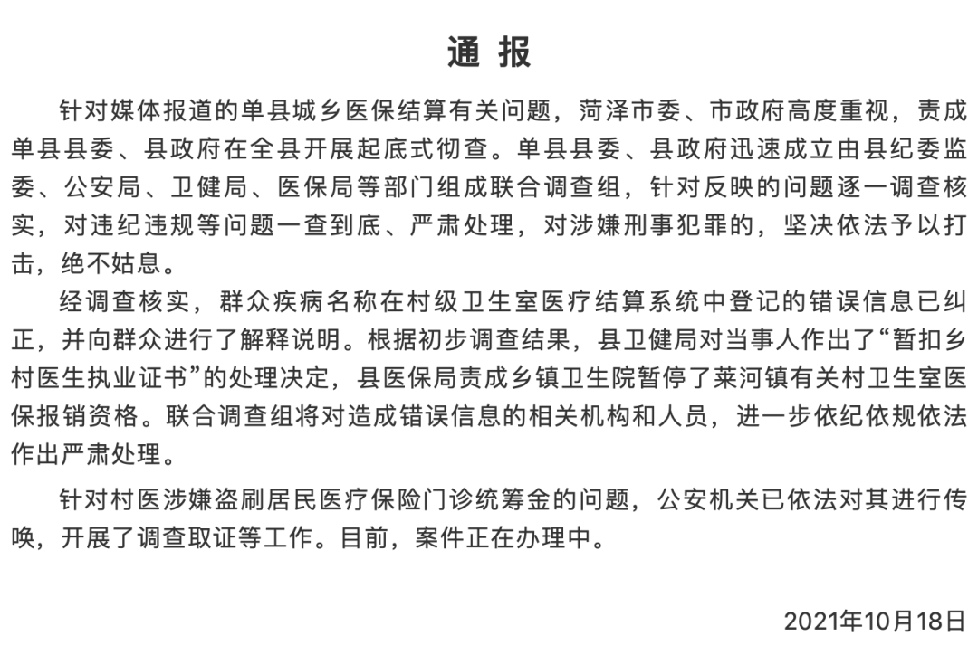 单县县委、县政府迅速成立由县纪委监委、公安局、卫健局、医保局等部门组成联合调查组,针对反映的问题逐一调查核实,对违纪违规等问题一查到底、严肃处理,对涉嫌刑事犯罪的,坚决依法予以打击,绝不姑息。