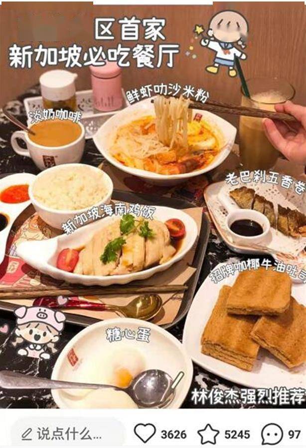 在多个社交平台上,极目新闻记者注意到,亚坤被推荐成为网红餐厅。多名美食博主称,亚坤为火遍新加坡的美食,已有70多年的历史,据说“去新加坡必做的事情”之一就是要去亚坤吃吐司和养生蛋。