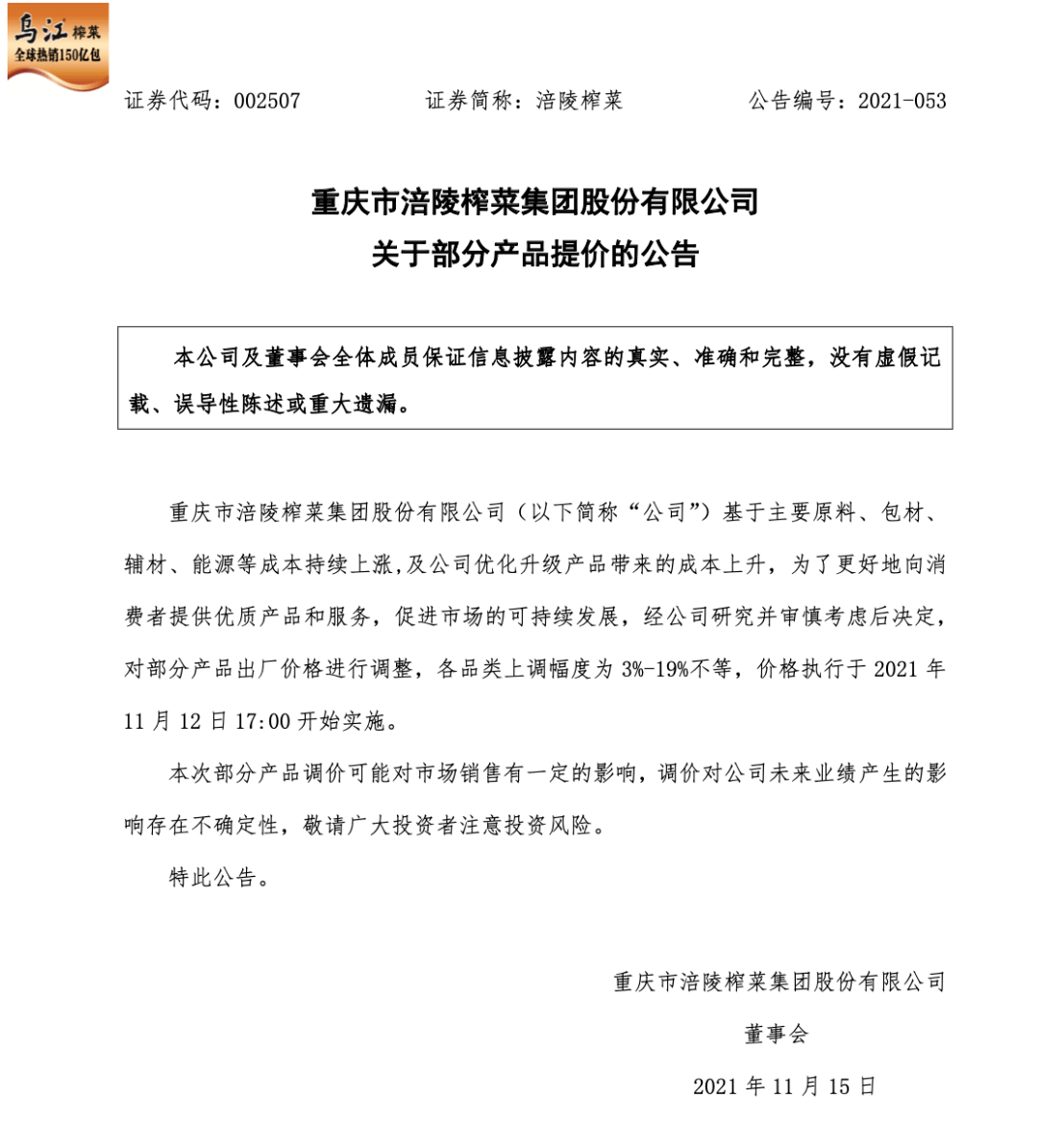 11月14日下午,涪陵榨菜发布关于部分产品提价的公告。公司表示,基于主要原料、包材、辅材、能源等成本持续上涨,及公司优化升级产品带来的成本上升,为了更好地向消费者提供优质产品和服务,促进市场的可持续发展,经公司研究并审慎考虑后决定,对部分产品出厂价格进行调整,各品类上调幅度为 3%-19%不等,价格执行于2021年11月12日17:00开始实施。