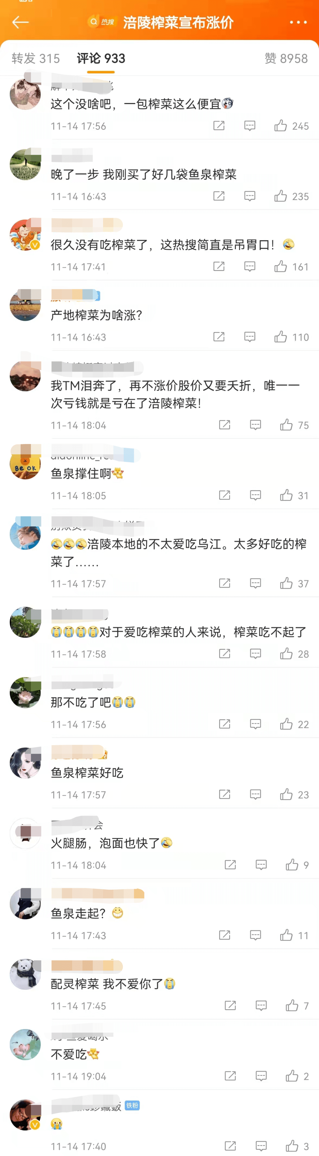 涪陵榨菜涨价消息迅速登上微博热搜榜,网友表示措手不及。