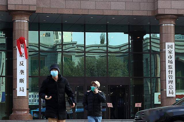 正对国家市场监督管理总局办公大楼,随着左侧柱子上的红布被揭下,“国家反垄断局”的全新名牌映入眼帘,它与被挂在右侧柱子上的“国家市场监督管理总局”的名牌迎面相对,左右拱卫。