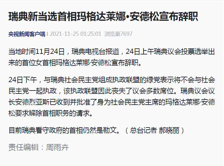 据央视新闻25日消息,当地时间11月24日,瑞典电视台报道,24日上午瑞典议会投票选举出来的首位女首相玛格达莱娜·安德松宣布辞职。