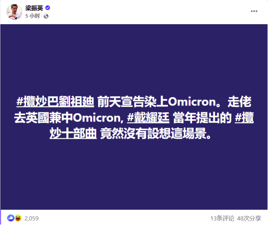 刘祖迪的帖文一出,就引来全国政协副主席、香港特别行政区前行政长官梁振英的嘲讽,他今日(2日)在脸书发文称,刘祖迪前天宣告染上奥密克戎,“走佬去英国兼中Omicron,戴耀廷当年提出的‘揽炒十部曲’竟然没有设想这场景”。
