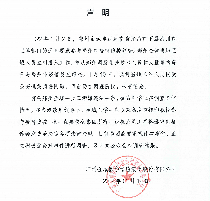 1月2日,郑州金域接到河南省许昌市下属禹州市卫健部门的通知要求参与禹州市疫情防控筛查。郑州金域当地区域人员立刻投入工作,并从郑州调拨相关技术人员和大批量物资参与禹州市疫情防控筛查。1月10日,我司当地工作人员接受公安机关调查问询,目前仍在调查阶段,未有结论。
