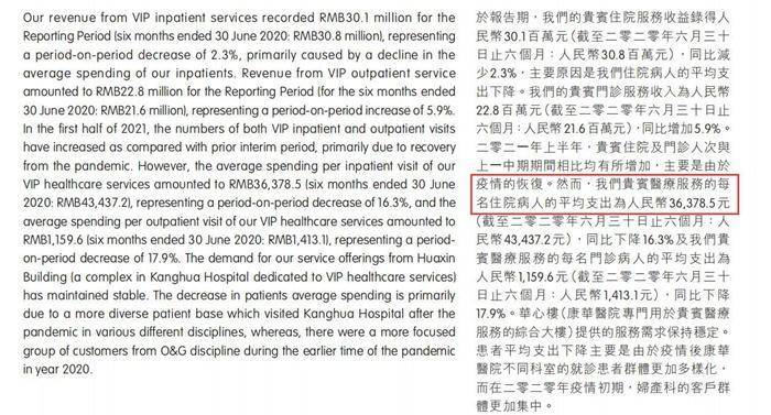 康华医疗2021年上半年财报还显示,集团的特殊服务是超出基本医疗服务的高端化医疗服务,主要针对高收入患者,贵宾医疗服务的每名住院病人的平均支出为36378.5元。