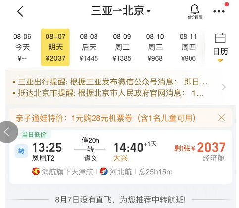 据第一财经报道,相比之下,不少国内城市更是暂停了三亚飞来的航班。比如今日成都和北京往返三亚的直飞航线都已经无票在售,明天三亚到北京和成都也没有直飞航班可买,要从三亚飞回只能选择中转航班。